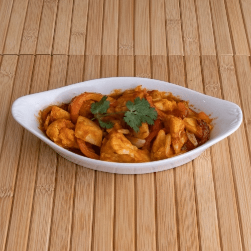 Kippendijfilet bereid in een pikante curry met grof gesneden paprika en ui