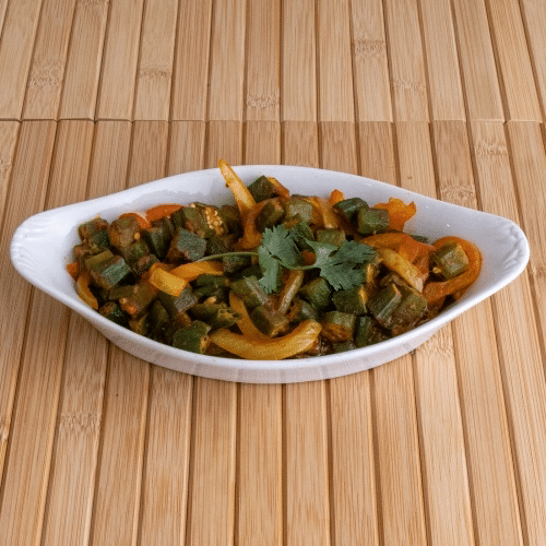 Okra bereid in een curry met paprika en ui, rijst of naan is optioneel bij te bestellen