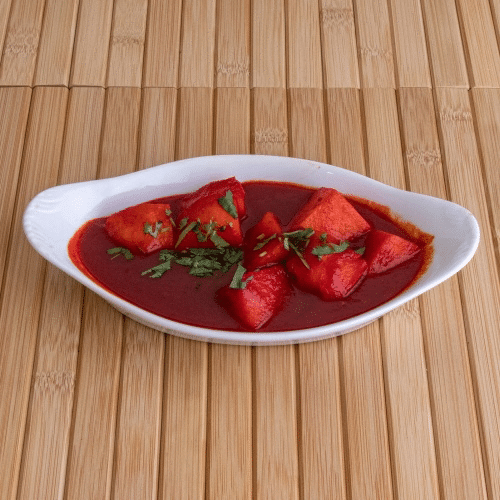 Aardappels bereid in een curry, rijst of naan is optioneel bij te bestellen