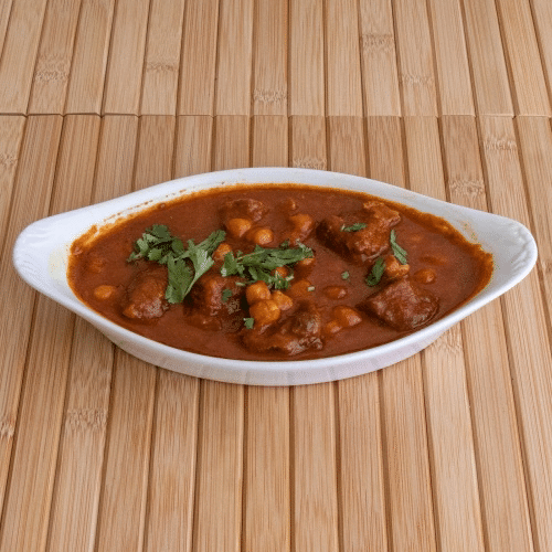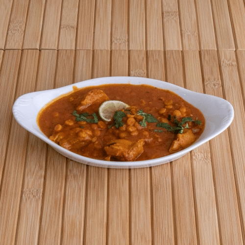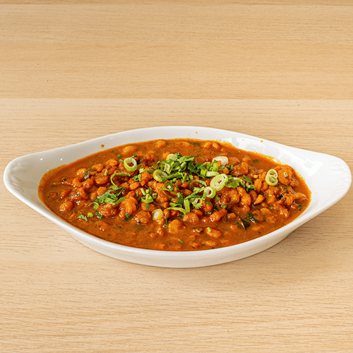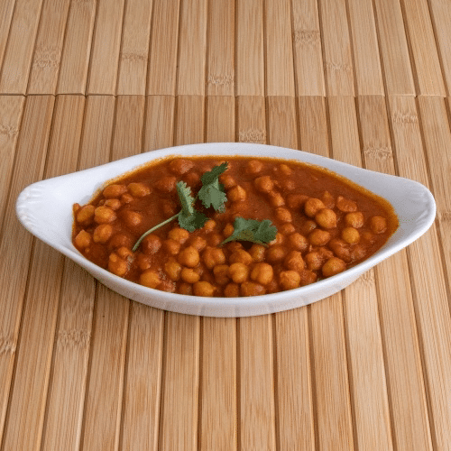 Kikkererwten bereid in een curry, rijst of naan is optioneel bij te bestellen