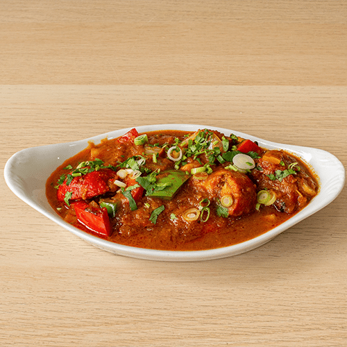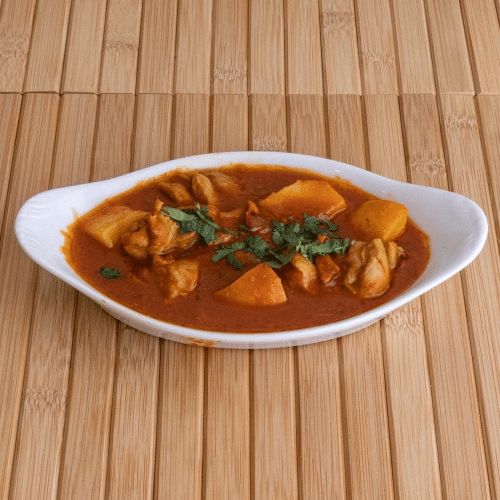 Kippendijfilet in een zeer pikante curry bereid met aardappel en peper