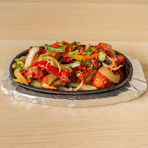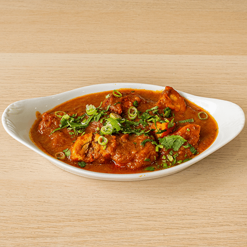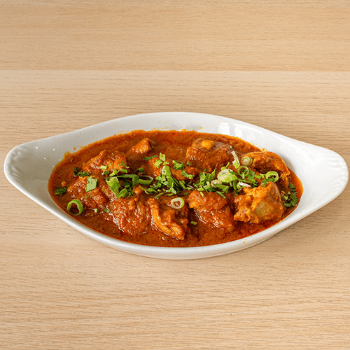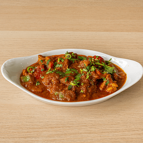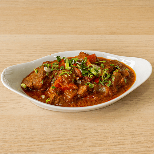 Lamsvlees bereid in een pikante curry met grof gesneden paprika en ui