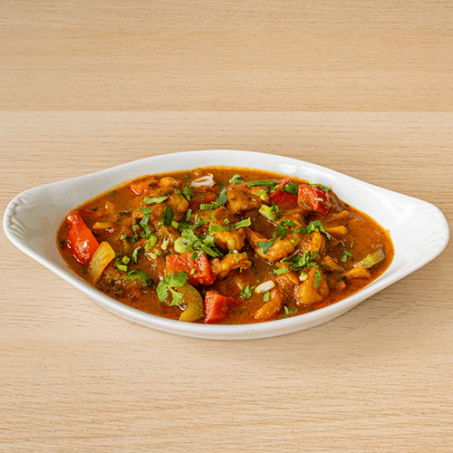 Geroosterde kippendijfilet bereid in een pikante curry met grof gesneden paprika en ui