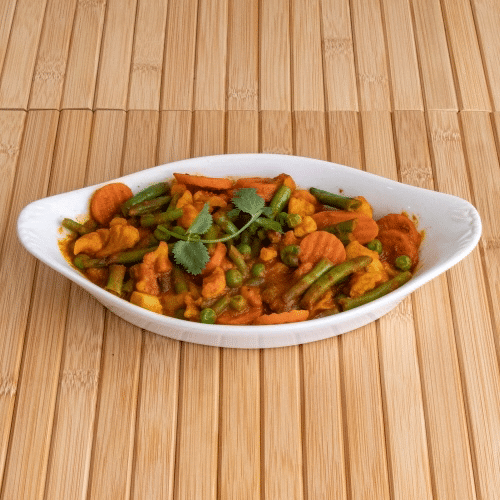 Verschillende groentesoorten bereid in een curry, rijst of naan is optioneel bij te bestellen