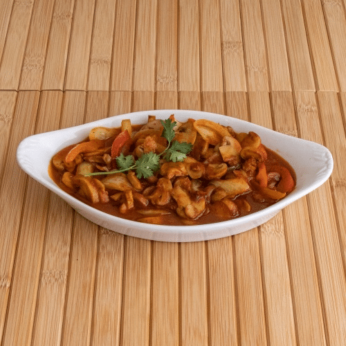 Champignons met paprika en ui breid in een curry, rijst of naan is optioneel bij te bestellen