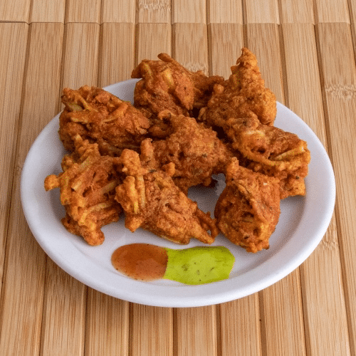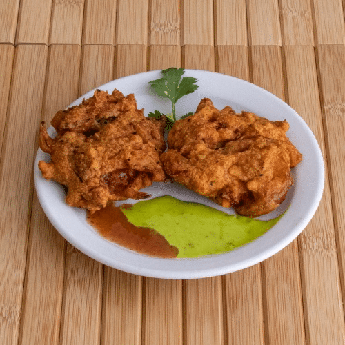 2 stuks. Gefrituurde beignet gemaakt van erwtenmeel, paprika en ui