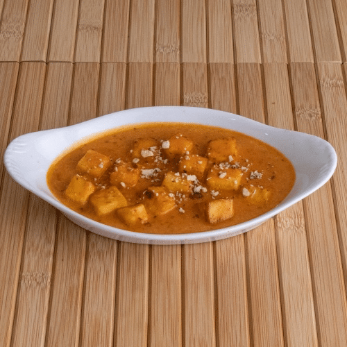 Indiase kaas bereid in een zoete, romige curry, rijst of naan is optioneel bij te bestellen
